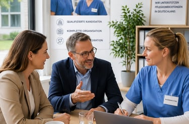 Bei der Vermittlung von Pflegefachkräften umfasst die Leistung ein erweitertes Spektrum, einschließlich sprachlicher Vorbereitung, Unterstützung im Anerkennungs- und Visumsprozess sowie organisatorischer Begleitung der Einreise (z. B. Flugplanung). Entsprechend erfolgt die Preisgestaltung auf Basis eines fairen und leistungsgerechten Modells.